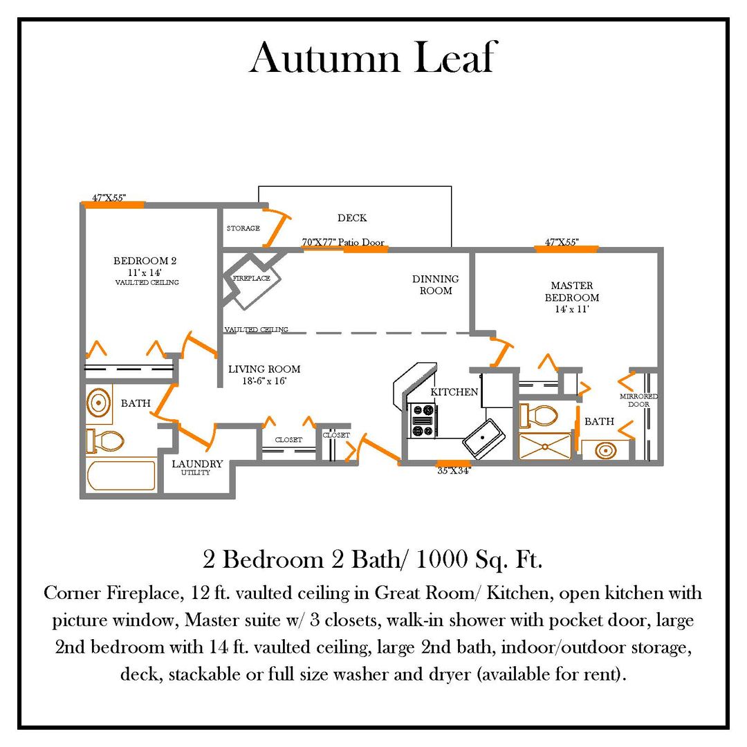 Our large floorplan located on the 2nd floor with a balcony, includes a living area with open kitchen, 14ft vaulted ceiling and view of the Wood burning Fireplace, picture window in kitchen, Master Suite includes a separate linen closet, large closet with bi-fold or mirrored doors, walk-in shower with pocket door, large 2nd bedroom with vaulted ceiling, large second bath with linen closet, and outdoor storage
